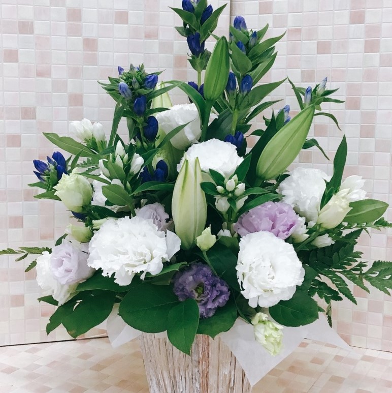 リンドウ、ユリ、トルコキキョウ、レモンリーフ、レザーファン
