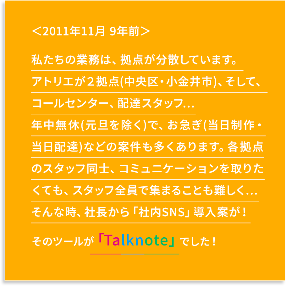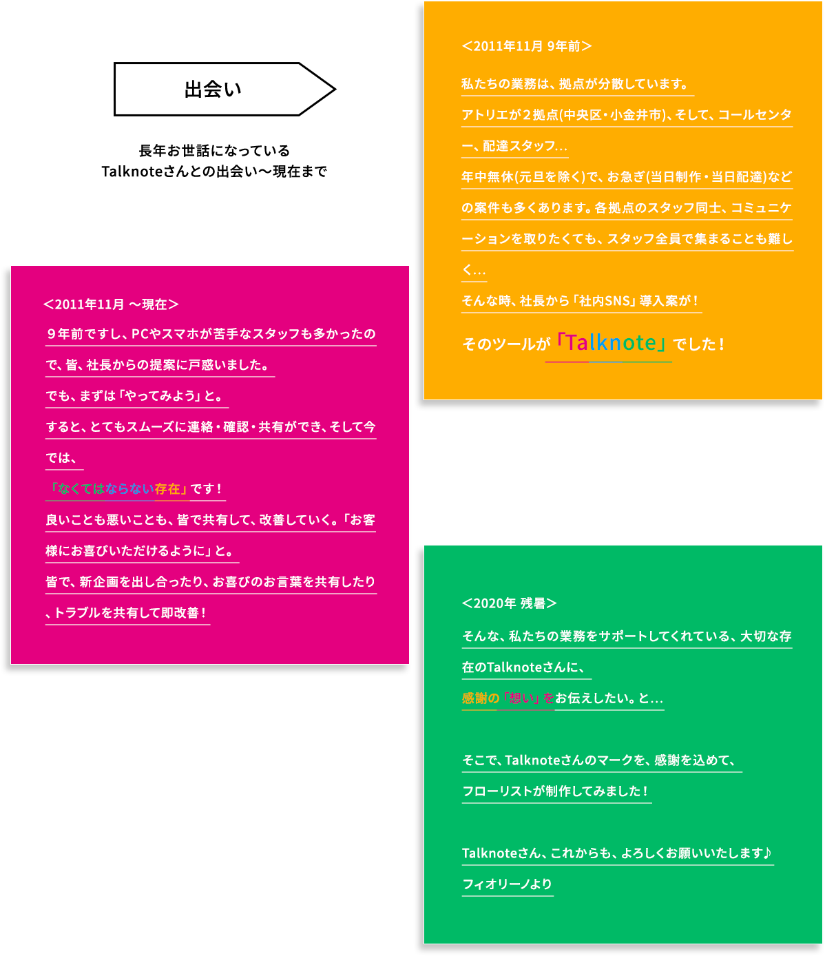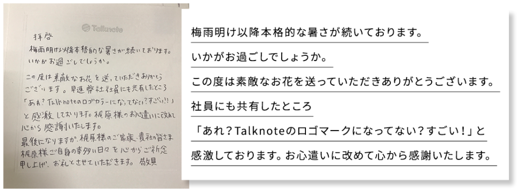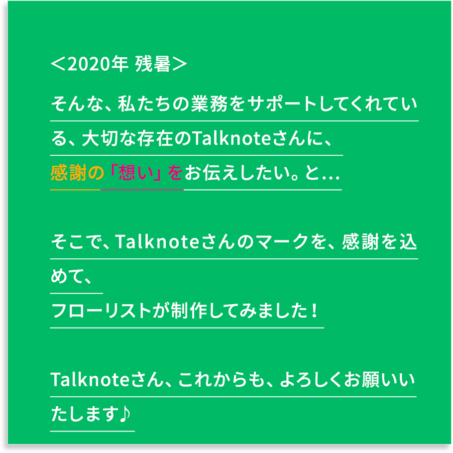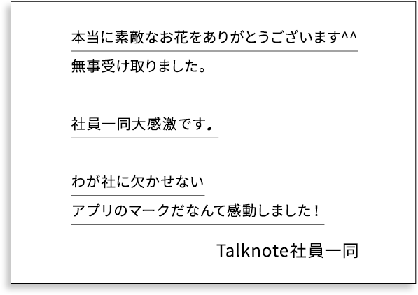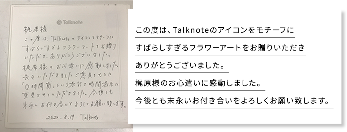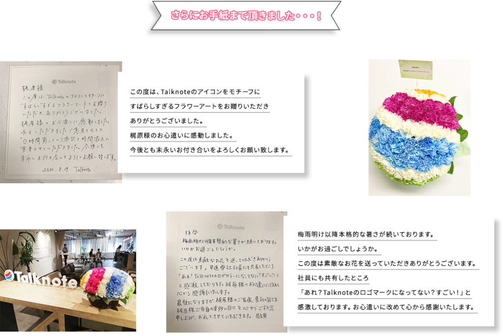 お客様の声特集 Talknote(トークノート)さんからお喜びの声をいただきました! 2020.09.24 お客様の声特集 Talknoteさんのホームページはこちら→https://talknote.com/ Tweet Share Hatena Pocket feedly Pin it RSS イメージ通りの出来栄えでした 3種類のご注文方法(パソコン編)